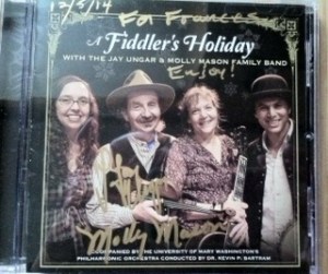 As I prepared to exit the theater at the end of the night, I was surprised to find Jay and Molly at the front desk autographing their CD’s. I happily fell in line and spotted the CD pictured here for sale. As I mentioned earlier, I had seen their daughter Ruthy (Ungar) and her husband Mike (Merenda), perform at this same theater in January. The faces on this CD are all of them in the order of Ruthy, Jay, Molly and Mike. When it was my turn to say hello, I mentioned having seen them years ago in Watertown. Molly had recollection of the stone structure of the Baptist Church. I was touched they could recall the night at all. Jay’s handshake was soft and warm. Molly’s was firm and cool. A blessing it was to touch the hands of these fine musicians. I went out into a messy, cold, slushy, rainy December night in Hardwick. I got home just fine and considered the rare privilege it had been to attend a performance by two of the finest American Acoustic Folk Artists of our Time. Jay and Molly.