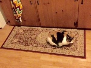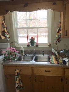 The inside is the area to adjust. The placement of the sink in front of a large sunny window is positive. The towels hanging down, dirty dishes and cluttered look are not. A trip to the local garden center was able to supply most of what feng shui encouraged for auspicious results. Here is a photo of the changed space.  At the top, a wind chime is hung that features a semi precious stone called citrine. Although it is not red, it is a sun color and the stone itself has qualities I wish to be famous for. The “citrine represents the solar plexus chakra which involves personal power and self-definition. Citrine is a symbol of hope and youth and brings energy, effectiveness, and spontaneity” said Gary Kvistad of Woodstock Chakra Chimes. The plant is a fiery red kalanchoe. The flower represents endurance and lasting affection. Two tapered red candles represent fire. Sun color dish towels now hang to the side not blocking the view. There’s a complimentary colored owl figurine all the way from sunny Sicily in the right corner. The space is cleaned and balanced. The sink, according to feng shui, is too close to the stove. After the dishes are cleaned, the bay leaf plant and flowering cyclamen are routinely placed between the areas of fire and water. I cannot move the sink and technically water will extinguish fire. Keeping the drains cleaned and covered when not in use is recommended. There may be some way to hide the sink when not in use with a large cutting board fitted to the space. This could be a cure. However, the cabinetry is knotty pine wood. Wood feeds fire and would be appetizing to the element. A rug has been placed on the floor in front of the sink. Now my feet are warm and the space feels more inviting.