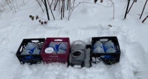 It took about two hours to produce this lot. Here they sit out in the snow. Another batch will be prepared and then it’s time. The snow/rain cycle has been active for weeks so additional moisture in the jug won’t be necessary for a while. The caps are off the jugs allowing the elements inside. There are drainage holes in each jug.