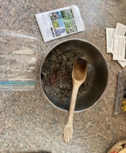 Some flower seeds that require a cold stretch hadn’t been prepared in any way until I viewed an online garden lecture with John Root. He spoke briefly on immersing seeds in wet vermiculite or sand, placing the mix in a plastic bag and storing in the back of the refrigerator for at least one month. So!  Sunday, this happened with two larger seed purchases from BetterBee and Prairie Moon Nursery. These photos show the process is quite easy to do. The seed size dictates the type of medium to use. Large seeds are better in vermiculite. Small seeds are better in sand. The plastic bags also contain tiny seeds from smaller packets pressed into a wet napkin. The seeds need the dark, cold and moisture to start to germinate. They’ll stay in the fridge until the last weekend in April. At that time, I’ll transfer them to a different container and hope they do germinate. The larger mixes are meant to be distributed over the prepared sites outside. I just need the weather to change to consistent warmth at 50º F with sun and rainfall to moisten the soil.
