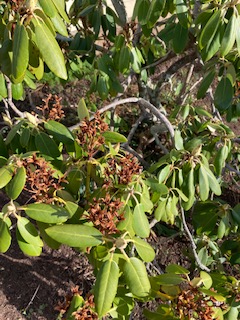 Gardeners can provide habitat for pollinators in ways they may not have realized. While the norm may be to prune out old dried rhododendron blossoms, consider that this may be the winter home for any number of insects. These colorful stalks are normally trimmed and tossed. If you must prune them off, don’t burn them, put them on the compost pile. Once temperatures reach a routine day time high of 50 F, any insects may emerge and seek refuge elsewhere.