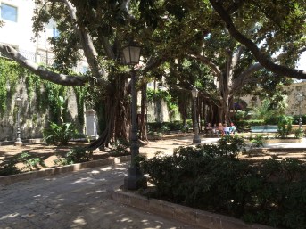 The shade offered a lovely resting place on a sunny afternoon. The planters around the park are filled with bird of paradise in full bloom. Incredibly large blossoms with black beaks and tall white plumes. In my native Massachusetts, the magnolia tree might reach 20 feet high and might live 20 years at best. They were in their glory in this island environment. Sicily is more arid than humid. There always seems to be a breeze and it cools off splendidly at night. Of course, I was visiting in May and found the climate most refreshing. We had rain for one or two days, but it was a nourishing kind. The one thing missing from this landscape are rivers and streams. I rarely saw the type of water common to my native New England. We are abundant with ponds, marshes, lakes, streams, and rivers. Sicily seemed to hide her fresh water sources. The rainy season is typically in fall and winter. I commonly read signs along the highways for torrente. These seemed to be deep ravines designed to hold large quantities of water. Maybe that’s how it is in Sicily, when it does rain, it can turn a stream into a torrent requiring containment. Everything about Sicily is fascinating.