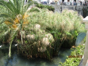 According to the guide book, “Arethuse was transformed to be a source of clear waters, which from Greece, through the Ionian Sea, reached Siracuse. So Alpheus decided to follow his beloved, transforming himself into a river and once he reached her, he mixed his waters with hers. The tale makes a clear connection with the indiscernible bond between Siracuse and Greece. Arethuse became the symbol of the city, called in fact Arethusean and it was represented in the silver coins in Siracuse of the 5th C BC.” As I connected to Earth, Air and Fire at Taormina, I blended with Water at Ortygia.