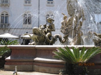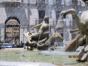 The large circular fountain in Ortygia is an elaborate depiction of a myth that was  unknown to me. The central figure was Artemis with her bow, at her foot was Arethusa, behind Artemis was  the river god Alpheus and in the water were  several figures riding sea creatures. A young boy rode a sea horse thrashing the waters. A mermaid and child rode  a wide-mouthed fish. A merman rode a sea turtle moving through the sea. The gentle spray of water surrounded thel figures above.