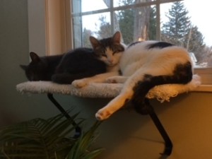 Stella is an adapter. Her instincts show her catitude to be spot on. She settled in with us and we found a pattern to our lives. Every evening, the expectation was she came in around suppertime and stayed in all night. I was wary of the many night creatures that might find her a tasty meal. And, she was a fair weather. So, Tesoro and Stella snuggled together on the window perch basking in winter sunlight. They cuddled on the sofa taking long cat snoozes. Stella was easy to pick up and play with. Tesoro watched us intently and came out of himself enough to play chase the string from time to time. A year went by before Tesoro found the nerve to walk outdoors. I was surprised to see him one Sunday come into the backyard and dash into the basement. The day was so mild, all the doors were open to welcome in the warm breezes. He found his courage and started to step outside his comfort zone. Stella was the motivation. He adored her and the separation pushed him to follow.