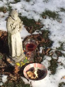 The day is calm and warm. Snow and ice cling to the earth already. The harsh frost filled morning melts into a tranquil afternoon. On this day, celebrate simply with an offering of seeds and suet to the birds. Enjoy the blue jays, morning doves, juncos and sparrows. Welcome the chickadee and finch. Give them a free meal today. In remembrance of the Earth, put out a simple feast of cake and wine. A little something to thank her for all she gave us this year and all she will give next.